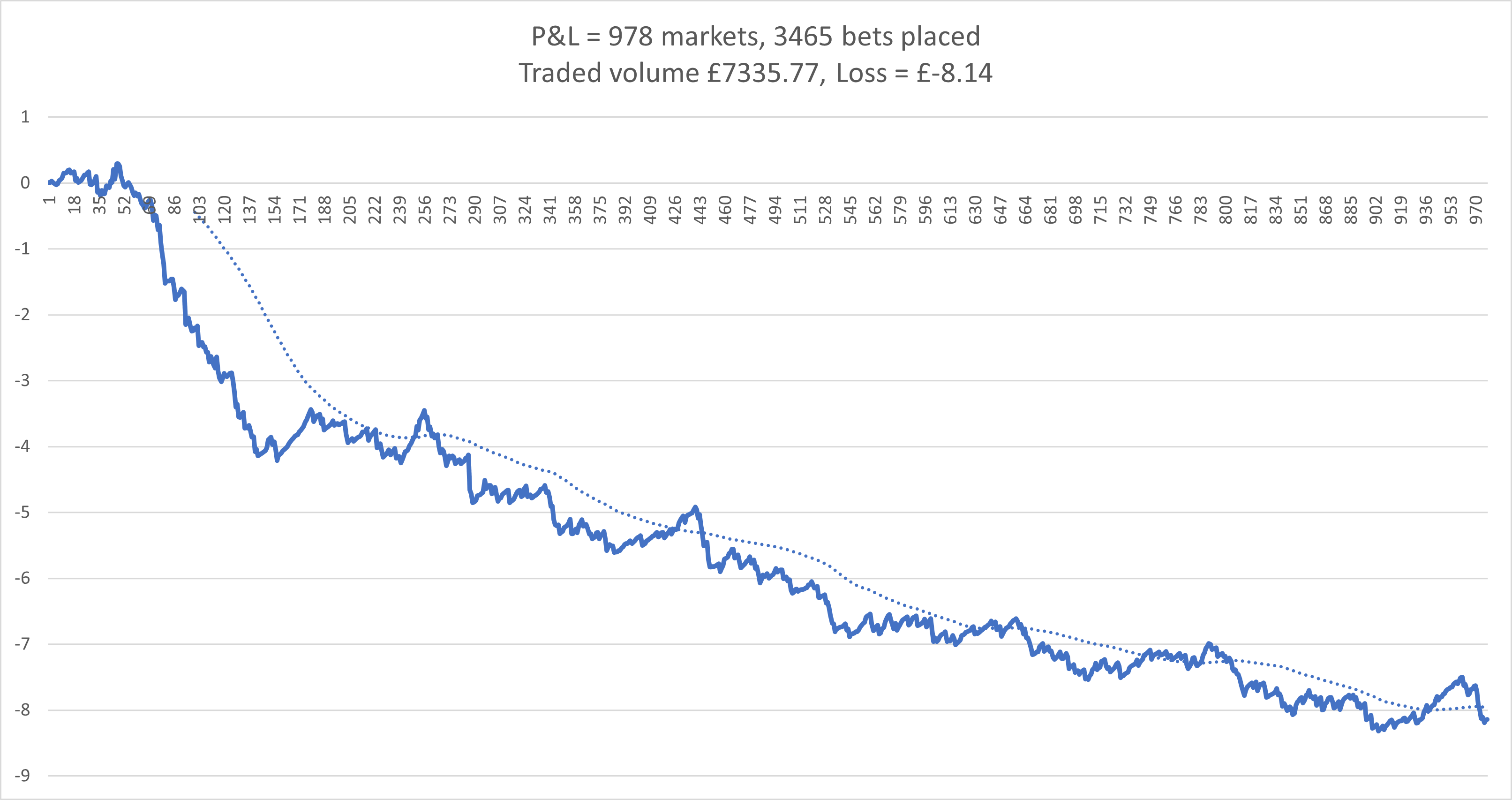 My data suggests I should be able to trade in around 40% of the markets I monitor. When I open the parameters to do this, I see more losses. When I tighten the parameters, there’s fewer trades and more profits, and I’m only entering around 15% of markets. But I’m struggling to see the difference between some of the made trades and some of missed ones. However, my data isn’t robust enough to be conclusive, so I might be way off with my thoughts.