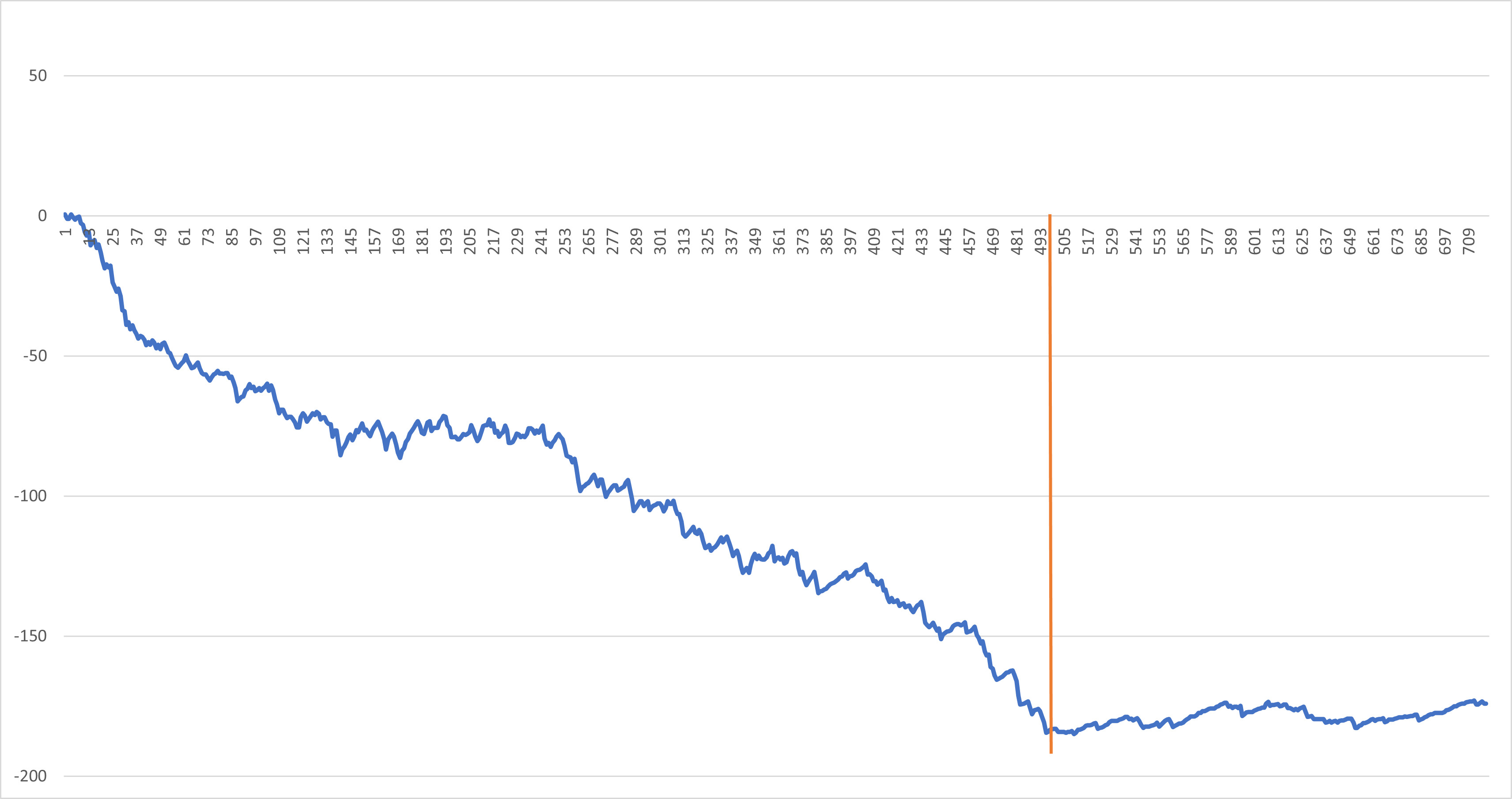 Here’s a chart from the past few weeks, the orange line indicates the point where my last significant change was made. Results after this are more positive and steady.