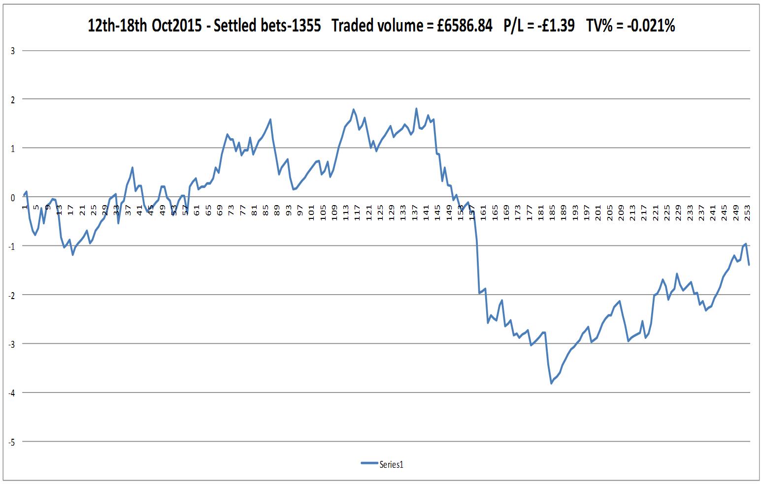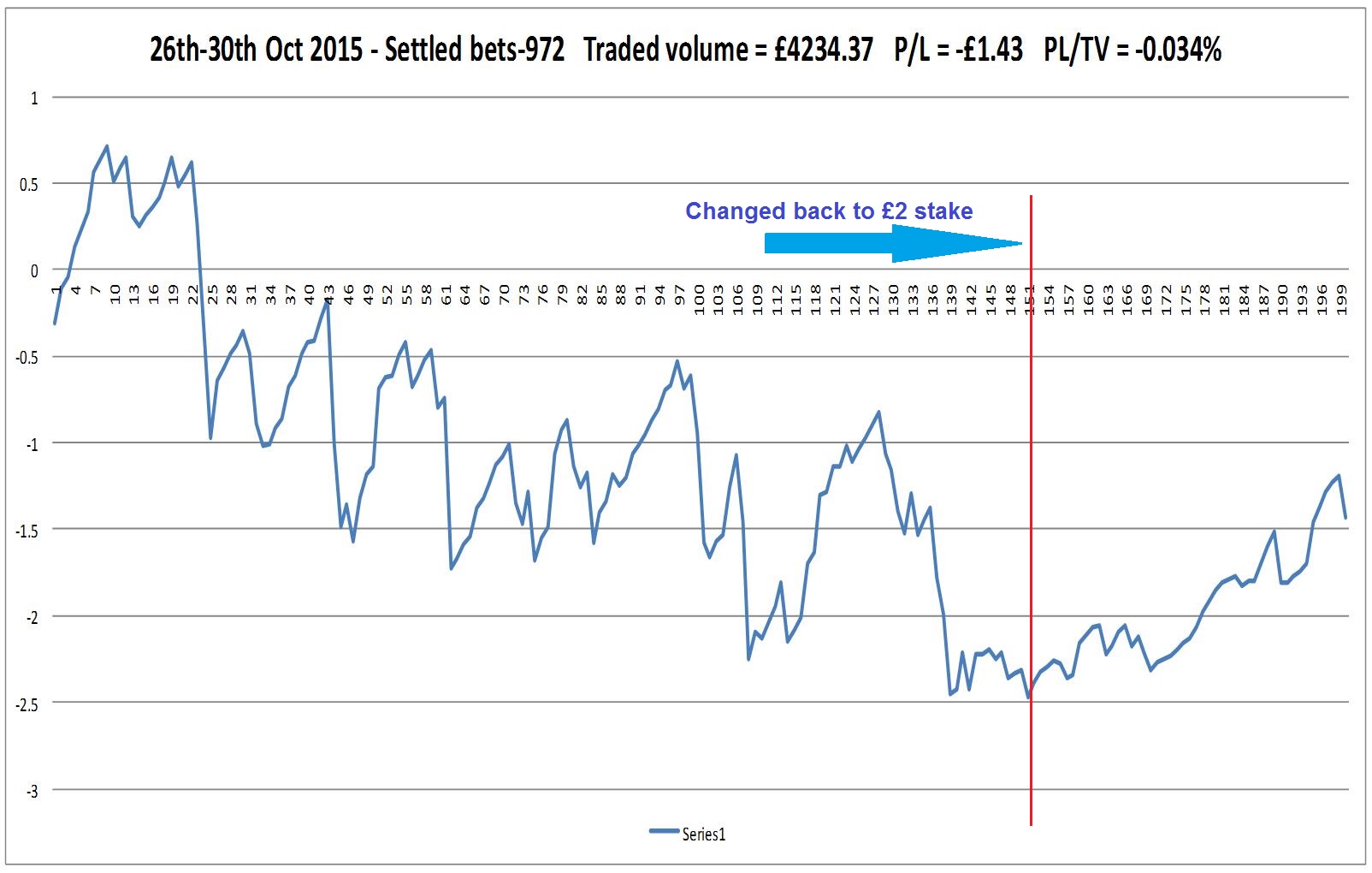 I adjusted the stake, on Thursday evening, back to a flat £2 after thinking that the current poor performance was related to the last staking plan change. As can be seen on the chart there was an immediate change in trend, the losses were less significant. I still think that the flat £2 (or any set number) is a bit crude and there may be a better way of staking but I need to do some proper testing and checking before implementing. For example around the whole numbers, ie at 2.00, 3.00, etc, the change in step per tick from say 0.02 to 0.05 can mean a disproportionate loss at 3 ticks than profit from 1 tick.